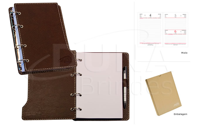 Agenda diária com ferragem 4 argolas, porta caneta, 344 páginas em papel off set 63gr ou em papel reciclado. 8 páginas em papel couche 115gr com mapas da América do sul, região norte, nordeste, Centro oeste, sudeste e sul mais o mapa do brasil – Indice telefônico – Planejamento para proximo ano, confeccionada em couro legitimo ou couro sintético. Personalizada em baixo relevo.