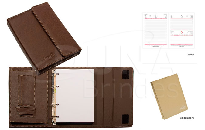 Agenda diária com ferragem 4 argolas, fechamento por velcro, porta cartões, porta pen drive, aba para encaixe de folhas, porta caneta, 344 páginas em papel off set 63gr ou em papel reciclado. 8 páginas em papel couche 115gr com mapas da América do sul, região norte, nordeste, Centro oeste, sudeste e sul mais o mapa do brasil – Indice telefônico – Planejamento para proximo ano, confeccionada em couro legitimo ou couro sintético. Agenda Personalizada em baixo relevo.
