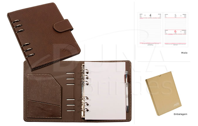 Agenda diária com ferragem 6 argolas, porta caneta, 344 páginas em papel off set 63gr ou em papel reciclado. 8 páginas em papel couche 115gr com mapas da América do sul, região norte, nordeste, Centro oeste, sudeste e sul mais o mapa do brasil – Indice telefônico – Planejamento para proximo ano, confeccionada em couro legitimo ou couro sintético. Agenda Personalizada em baixo relevo.