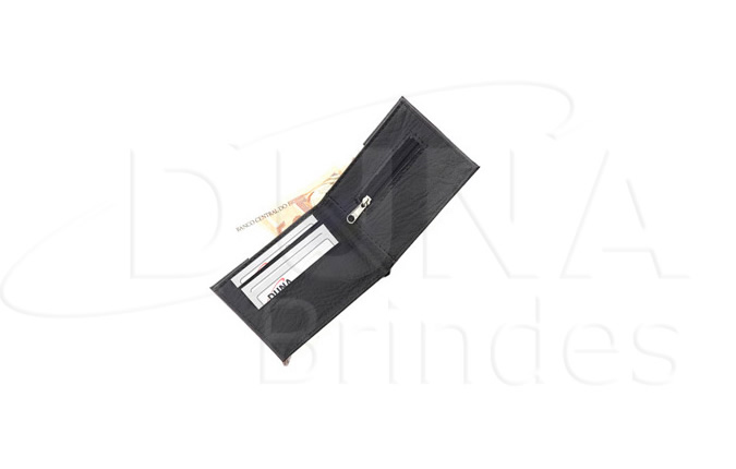 Carteira personalizada com sua logomarca, com porta moedas e três divisórias para cartões. Carteira confeccionado em couro legítimo, couro sintético ou couro ecológico (Recouro).