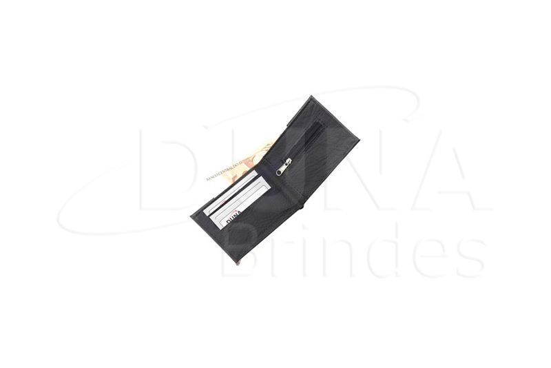 Carteira personalizada com sua logomarca, com porta moedas e três divisórias para cartões. Carteira confeccionado em couro legítimo, couro sintético ou couro ecológico