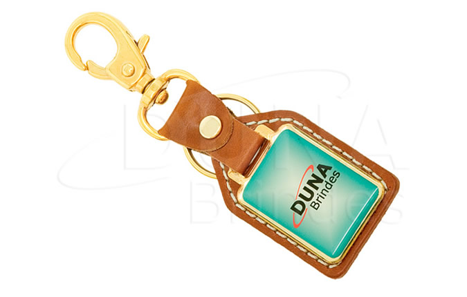 Chaveiro com base de couro legítimo, plaqueta em metal dourado ou niquelado com impressão digital resinada, argola e mosquetão.