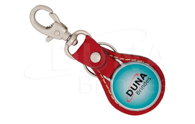 Chaveiro redondo com base de couro legítimo, plaqueta em metal dourado ou niquelado com impressão digital resinada, argola e mosquetão.