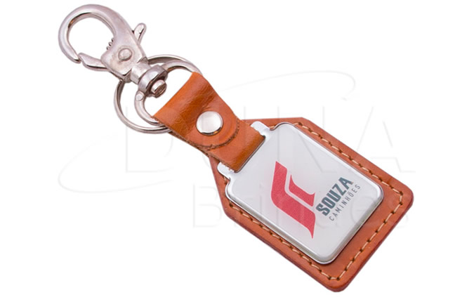 Chaveiro retangular com base de couro legítimo, plaqueta em metal dourado ou niquelado com impressão digital resinada, argola e mosquetão.