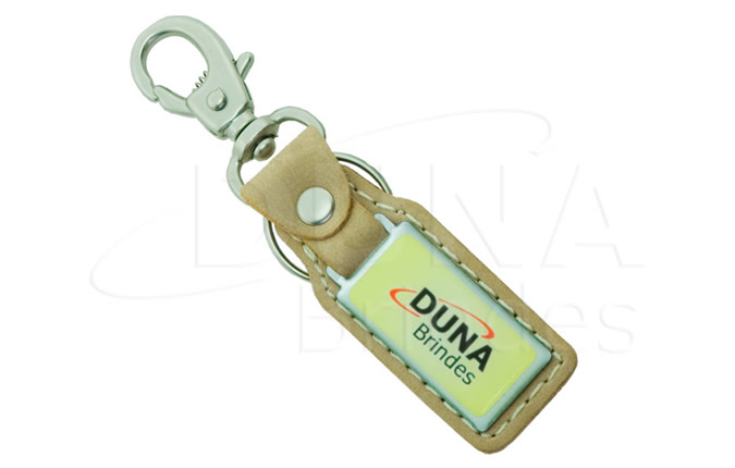 Chaveiro com base de couro legítimo, plaqueta em metal dourado ou niquelado com impressão digital resinada, argola e mosquetão.
