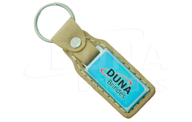 Chaveiro Light com base de couro legítimo, plaqueta em metal dourado ou niquelado com impressão digital resinada e argola.