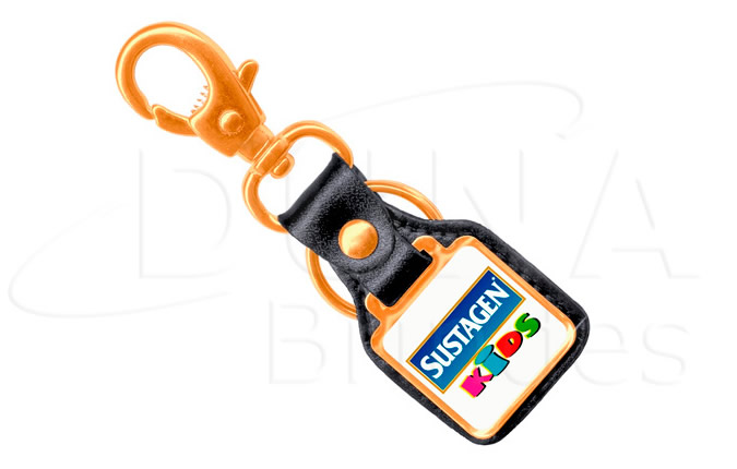 Chaveiro Duna midi com base de couro legítimo, plaqueta em metal dourado ou niquelado com impressão digital resinada, argola e mosquetão.