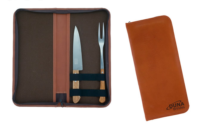 Kit churrasco com estojo em couro sintético contendo uma faca de 8″ e um garfo trinchante. Kit churrasco com estojo e faca personalizados com sua logomarca.