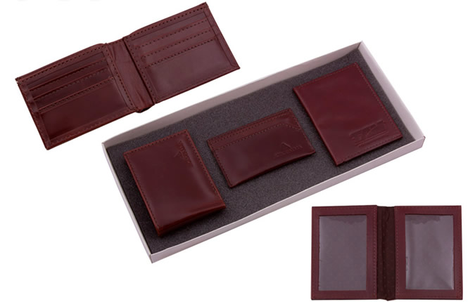 Kit contendo um porta cartão (Ref. PC 1702), uma carteira (Ref. CA 1804) e um porta documento (Ref. PD 2001) acomodados em uma caixa de papelão.