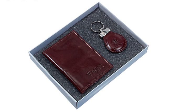Kit contendo um porta documento veicular (ref. PD 2008) e um chaveiro (ref. CC 402) acomodados em uma caixa de papelão. Kit Personalizado com sua logomarca.