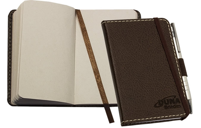 Moleskine contendo 100 folhas, confeccionado em couro legítimo, sintético ou ecológico. Personalizado em baixo relevo.