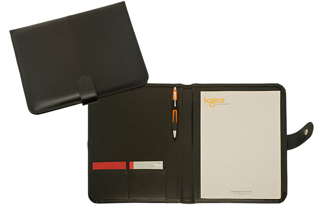 Pasta congresso confeccionada em couro legítimo, couro sintético ou couro ecológico (Recouro), contendo dois porta cartões, porta caneta, aba para papéis e porta bloco (A4). Pasta personalizada em baixo relevo.