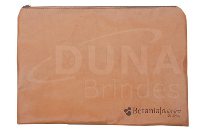 Pasta congresso confeccionada em couro legítimo, couro sintético ou couro ecológico (Recouro), fechamento por ziper e personalização em baixo relevo de sua logo.
