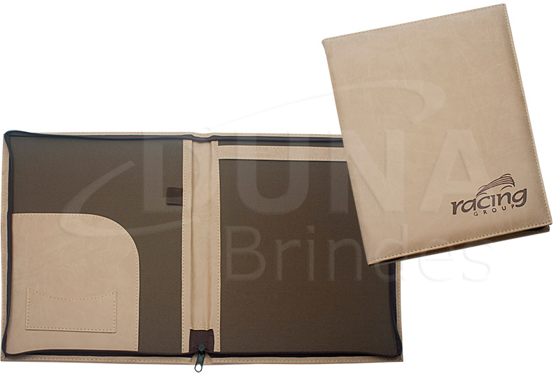 Pasta de Convenção confeccionada em couro legítimo, couro sintético ou couro ecológico (Recouro), fechamento por ziper, aba para papéis, porta cartão, porta caneta e porta bloco (A4). Pasta Convenção promocional com sua logomarca.