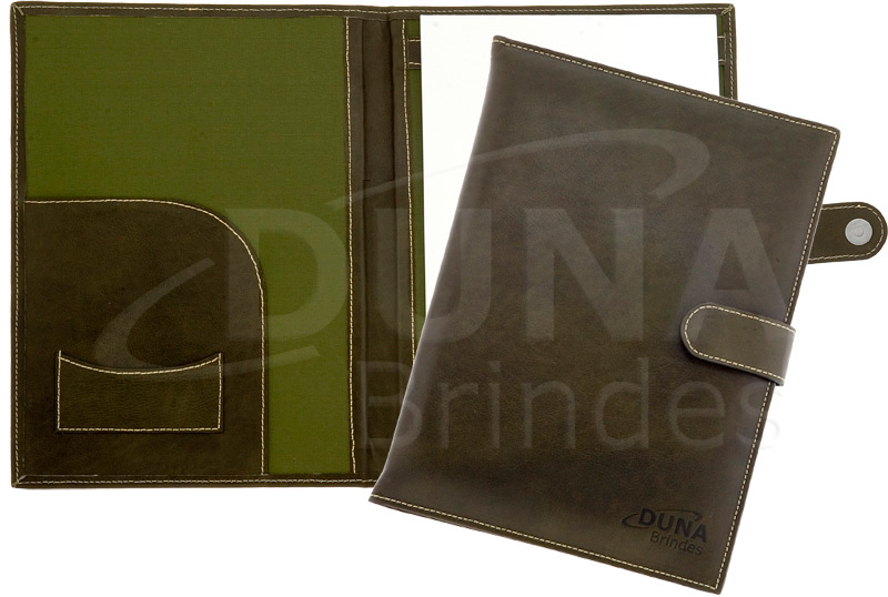 Pasta de Convenção confeccionada em couro legítimo, couro sintético ou couro ecológico (Recouro), fechamento por ziper, aba para papéis, porta cartão, porta caneta e porta bloco (A4). Pasta Convenção promocional com sua logomarca.