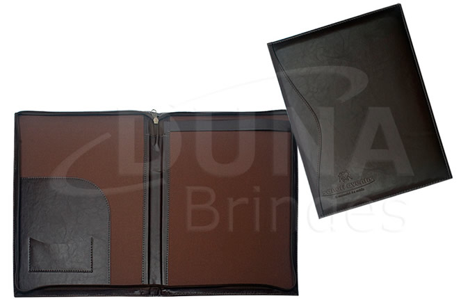 Pasta de Convenção confeccionada em couro legítimo, couro sintético ou couro ecológico (Recouro), capa com recorte, aba para encaixe de papéis, porta cartão, porta caneta e porta bloco (A4). Pasta de convenção personalizada com sua logomarca.