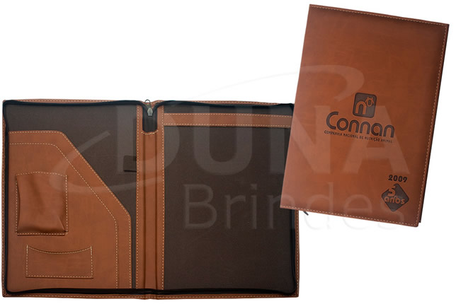 Pasta de convenção confeccionada em couro legítimo, couro sintético ou couro ecológico (Recouro). Duas abas para papéis, porta calculadora, porta cartão, porta caneta e porta bloco (A4). Pasta de Convenção com fechamento por ziper.