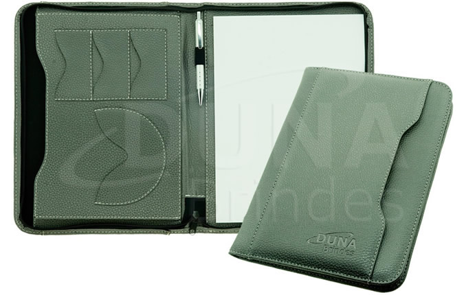 Pasta de convenção confeccionada em couro legítimo, couro sintético ou couro ecológico (Recouro), capa com porta papéis, uma bolsa interna para caderno, três porta cartões, porta cd, porta caneta e porta bloco (A4). Fechamento por ziper com uma gravação em baixo relevo. (caneta não inclusa)