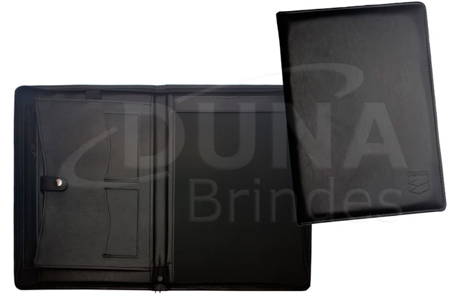 Pasta para convenção confeccionada em couro legítimo, couro sintético ou couro ecológico (Recouro), fechamento por ziper, duas bolsas internas, porta caderno, quatro divisórias para cartão, porta caneta e porta bloco (A4).