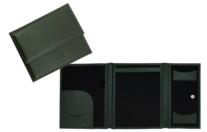 Pasta para convenção confeccionada em couro legítimo, couro sintético ou couro ecológico (Recouro), com uma aba para papéis, dois porta cartões, porta caneta e porta bloco (A4).