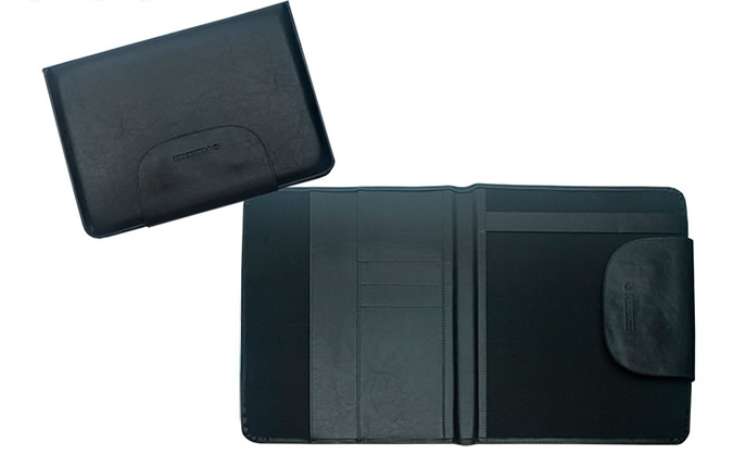Pasta para convenção confeccionada em couro legítimo, couro sintético ou couro ecológico (Recouro), com fechamento por velcro. Aba para encaixe de papéis, porta cartões e porta bloco (A4).