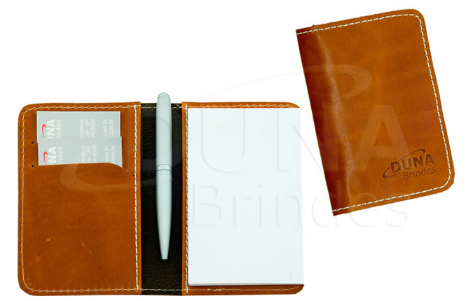 Porta Blocos de anotações personalizado em baixo relevo com sua logomarca, com duas divisórias para cartões e bloco com 50 folhas medindo 115 x 70 mm. Porta Bloco de anotações confeccionado em couro legítimo, couro sintético ou couro ecológico (Recouro). Caneta não inclusa.