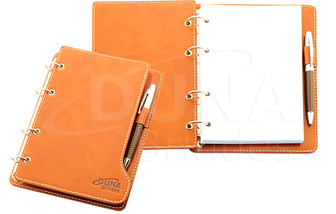 Porta Blocos com ferragem quatro argolas, confeccionado em couro legítimo, couro sintético ou couro ecológico (Recouro). Acompanha bloco para anotações medindo 15 x 20 cm, com 150 folhas (Caneta não inclusa). Porta Bloco personalizado em baixo relevo.