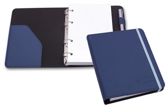 Porta Bloco confeccionado em couro legítimo, couro sintético ou couro ecológico (Recouro), com ferragem quatro argolas, porta caneta, aba para encaixe de papéis, porta cartões e fechamento por elástico. Porta Blocos personalizado em baixo relevo.