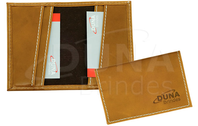 Porta cartão com quatro divisórias confeccionado em couro legítimo, couro sintético ou couro ecológico (Recouro). Porta cartão personalizado em baixo relevo.