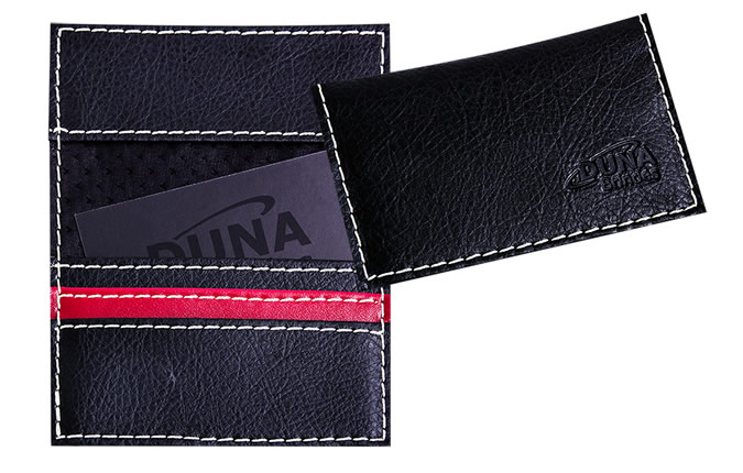 Porta cartão com quatro divisórias confeccionado em couro legítimo, couro sintético ou couro ecológico (Recouro) com uma gravação em baixo relevo.