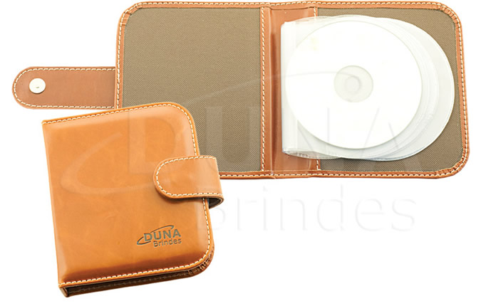 Porta CD’s confeccionado em em couro legítimo, couro sintético ou couro ecológico (Recouro), fechamento magnético e capacidade para 24 cds. Porta CD’s personalizado com gravação serigráfica ou baixo relevo.