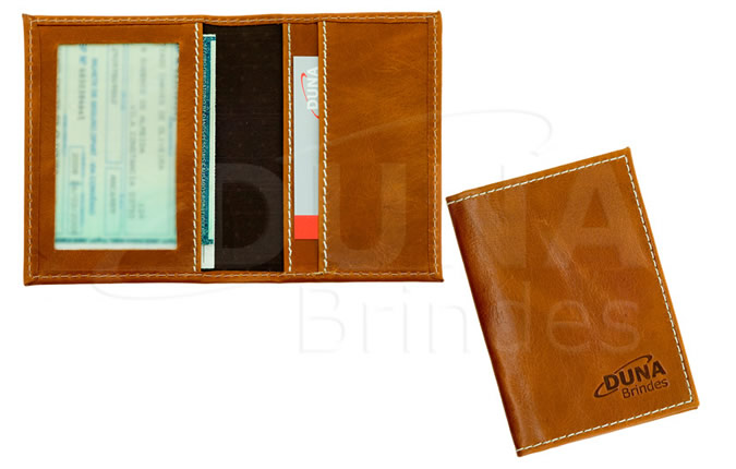 Porta Documento com moldura e duas divisórias para cartões, confeccionado em couro legítimo, couro sintético ou couro ecológico (Recouro) e gravaçao de sua logomarca em baixo relevo ou silk screen.